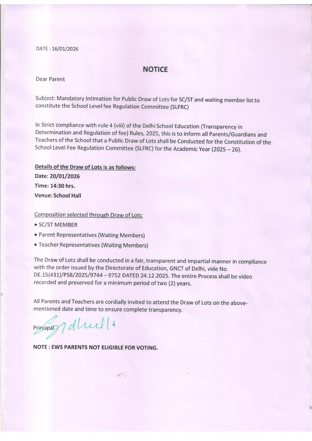 Mandatory Intimation for Public Draw of Lots for SC/ST and waiting member list to constitute the School Level fee Regulation Committee (SLFRC)